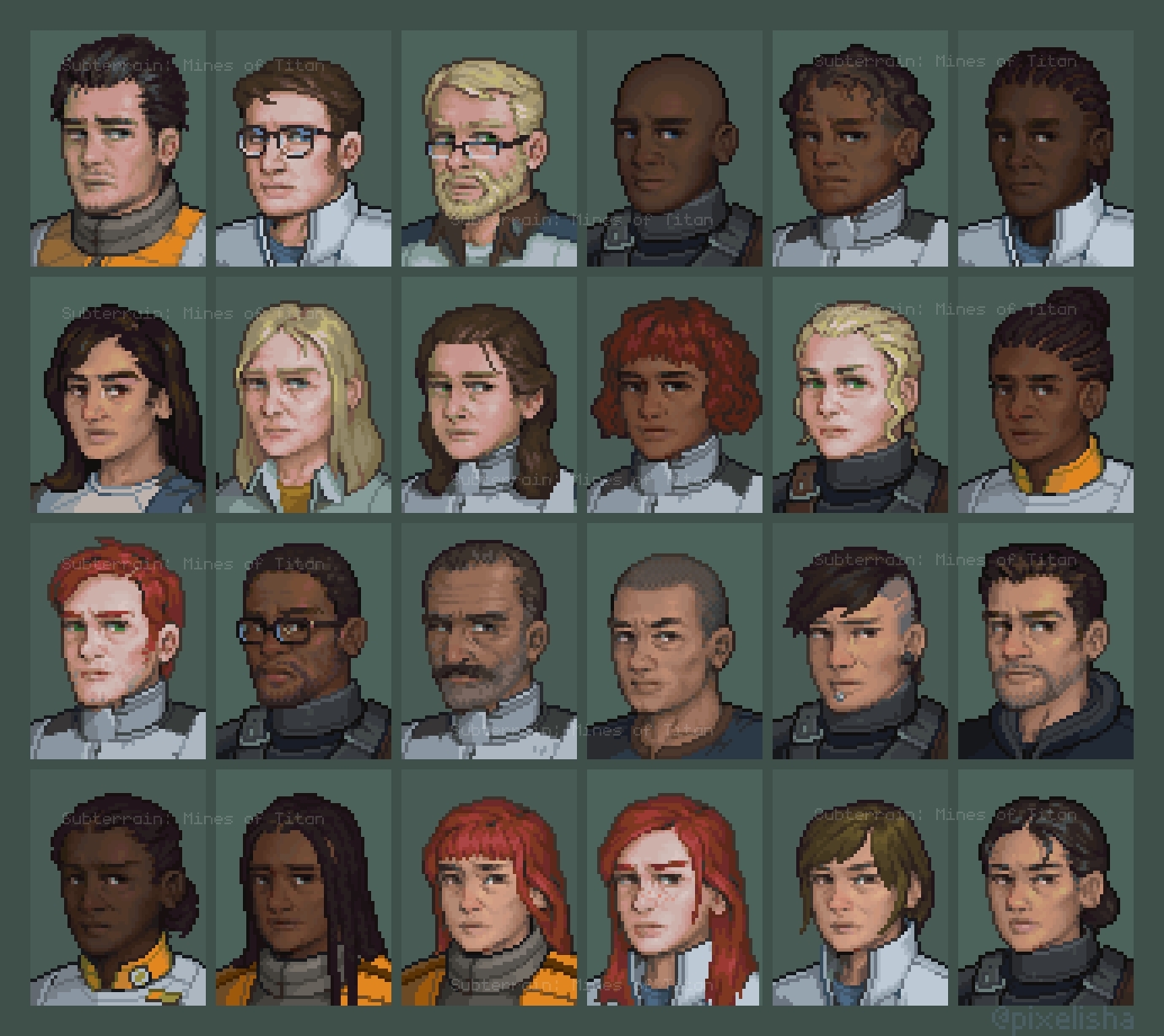 Main menu splash screen and over 90 character portraits for Subterrain: Mines of Titan by Pixellore Inc.